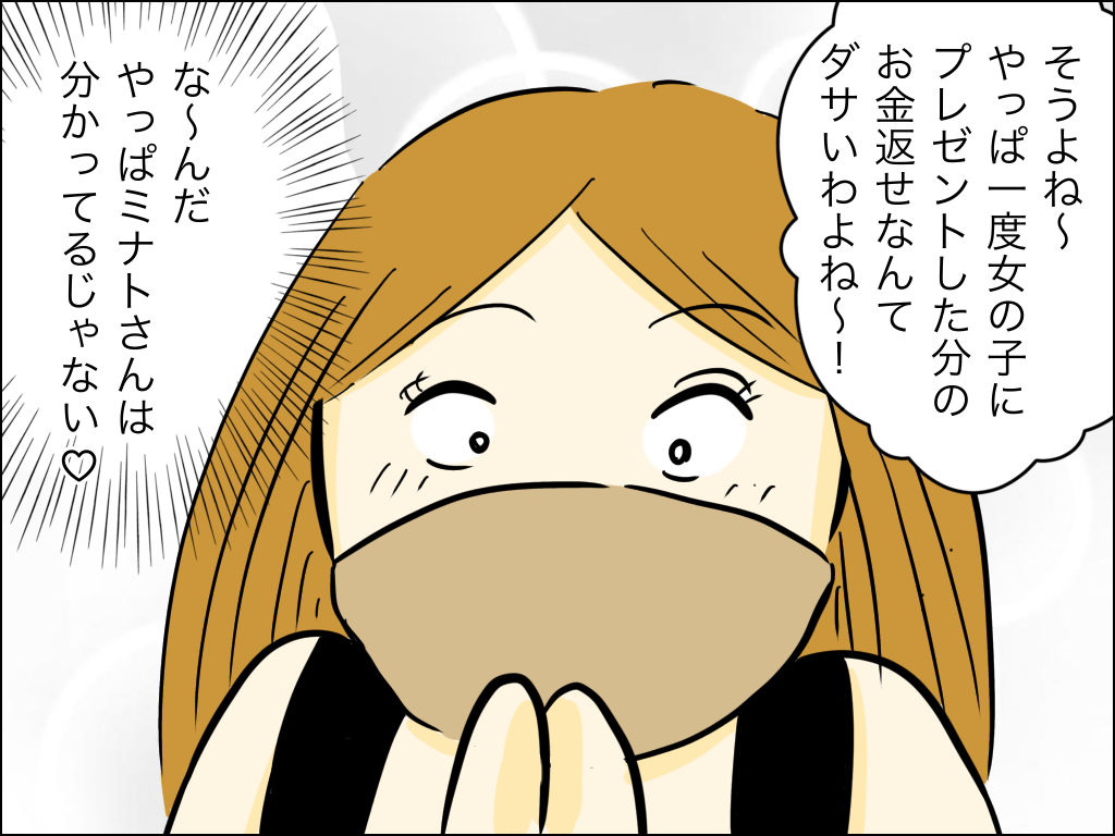 マッチングアプリで会ったたかり女を懲らしめた話【37】 訪問ありがとうございます😊優斗さんが言うのはもちろん…?前回のお話はこちら💁♀️ 1話から読む では続きをどうぞ💁♀️図々しい事を考えている貴莉だが…? ... 2023/06/21 訪問ありがとうございます😊優斗さんが言うのはもちろん…?前回のお話はこちら💁♀️ 1話から読む では続きをどうぞ💁♀️図々しい事を考えている貴莉だが…?続きを読む タグ :#マスク美人#詐欺写真#加工写真#マッチングアプリ#たかり女#飯もく